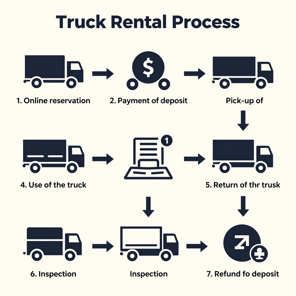 An infographic illustrating the truck rental process. The image includes the following steps: